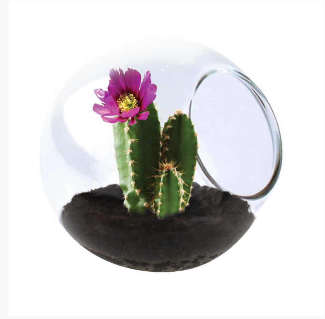 Introducing DuneCraft's new addition to their glass line, the Tiny Terrarium. A wonderfully tiny glass terrarium that is perfect for any spot you can find. Only 1.5 inches wide and as charming as can be! Tiny Terrariums are a vibrant, unique way to inject a little greenery into any space. The cactus will thrive as it conforms to the size of the terrarium. Cacti are easy to grow and require little water. Best result will form when placed in bright, indirect light or full sun.