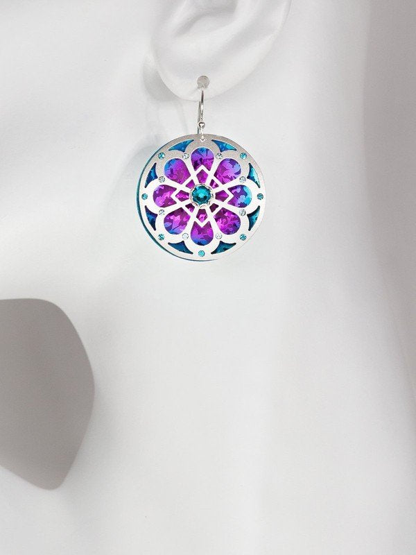 Elegant mosaics of color and design congregate in the Morning Light Earring. Hand-colored niobium is layered behind precisely detailed metalwork and set with rich Swarovski crystals that illuminate the imagination with beauty and spirit.