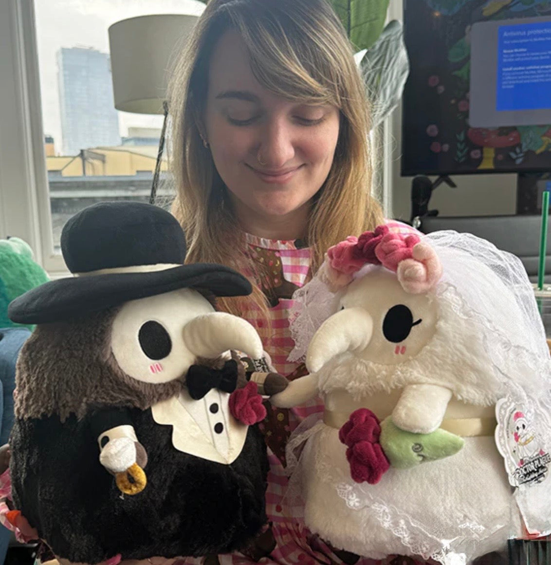 This Plague Nurse was designed by fan request as a counterpart for our Plague Doctor Squishable. The side of the lantern has been swapped so the two can hold hands. Rest assured, they would only do so after washing those hands extensively.